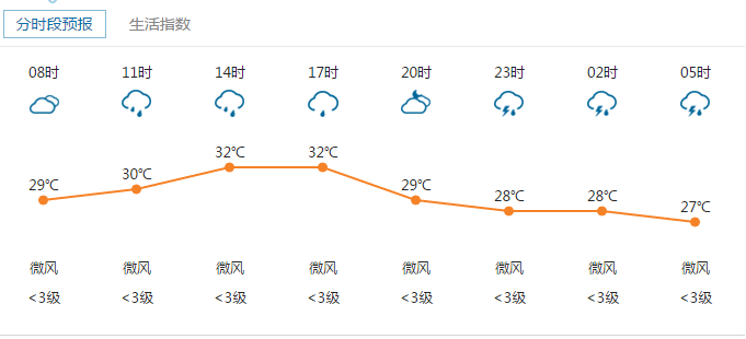 【上班天气】预计早晨8-9时,全市多云,有阵雨或雷阵雨;气温28-30℃;相对湿度75%-95%;西南风2-3级,局地阵风6级;全市能见度较好,普遍在10公里以上。天气不稳定,有雷阵雨,外出请注意带伞。