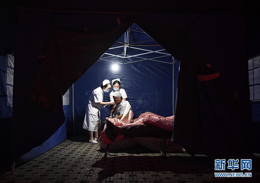 8月9日凌晨5点,九寨沟县人民医院护士在搭建的帐篷里为伤员打破伤风针。新华社记者 刘坤 摄