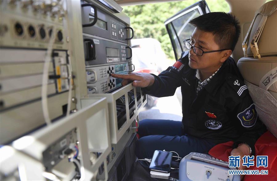 8月9日,中国电信工作人员在九寨沟景区调试应急通信设备。新华社记者 刘坤 摄