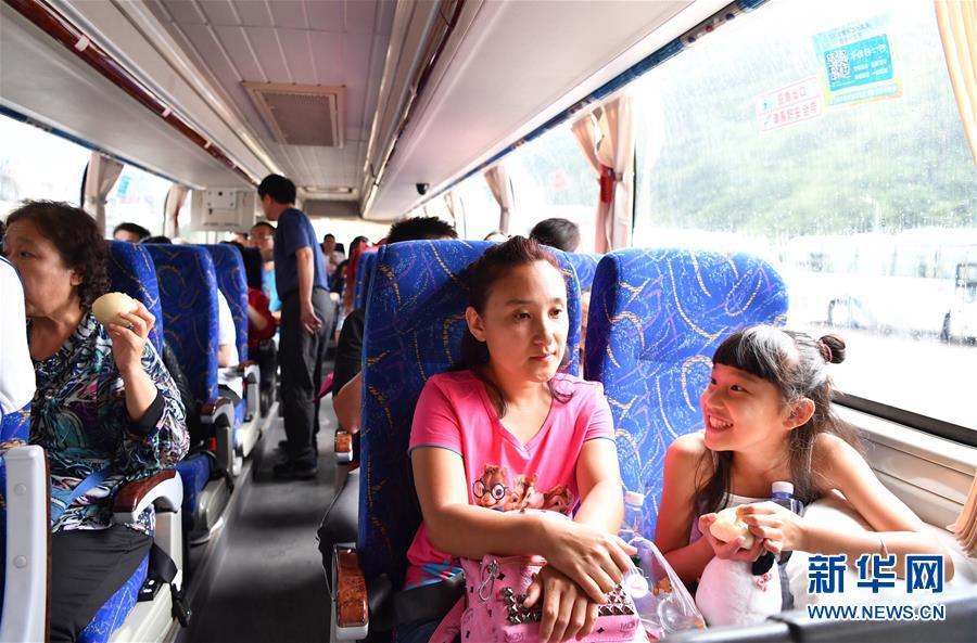 8月9日,在绵阳市平武县平武汽车客运站,10岁的关思雨(右一)和妈妈坐在返回成都的大巴车上。因地震从九寨沟撤出的旅客在平武汽车客运站转乘客运大巴返回成都、绵阳等地。新华社记者李鑫 摄