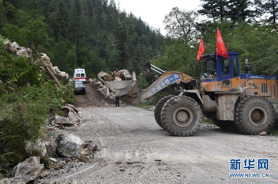 8月9日,工程车辆在九寨沟县境内疏通因滑坡阻断的S301线。新华社记者 范培珅 摄