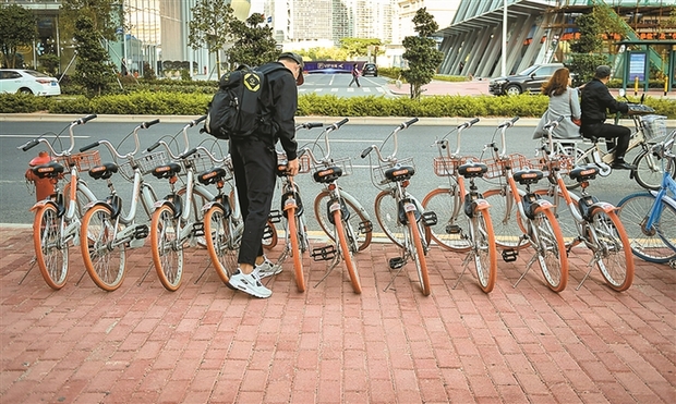 昨晨,全国多地网友称,使用摩拜单车在开锁环节遭遇“卡壳”。图为深圳地铁11号线后海站旁的一个共享单车点。(资料图)