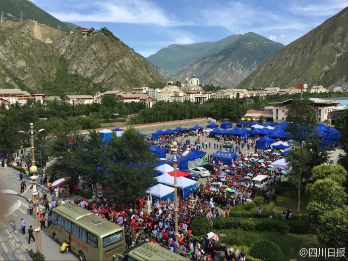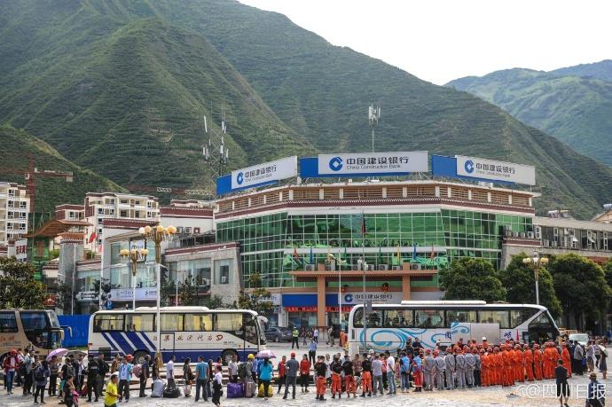 九寨沟县城广场民众排队乘80辆大巴撤离