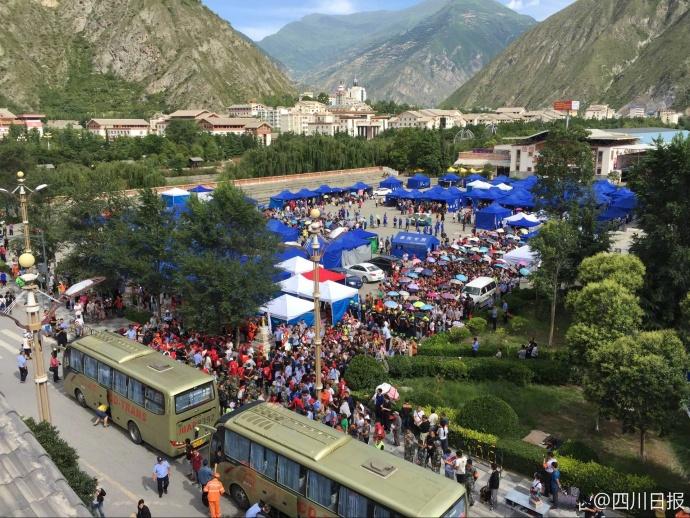 九寨沟县城广场民众排队乘80辆大巴撤离
