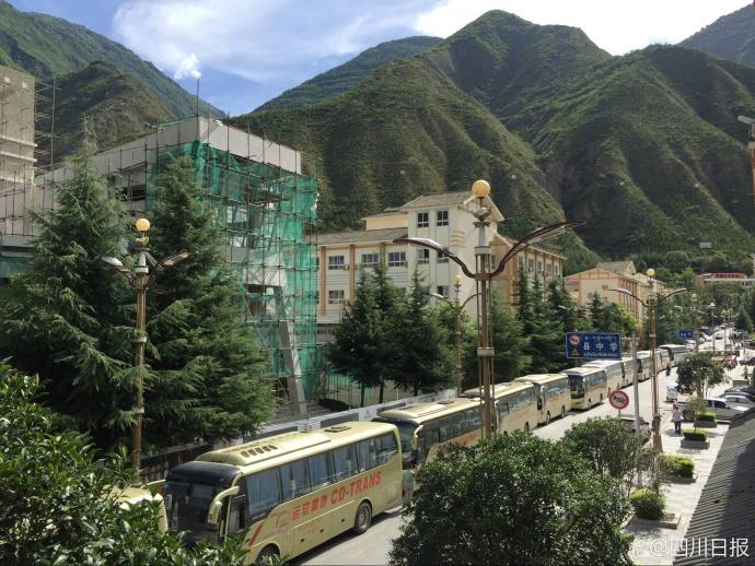 九寨沟县城广场民众排队乘80辆大巴撤离