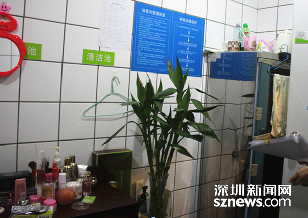 在一间门前标识有“消毒间”字样的房间内,可见墙壁上张贴有“冲洗池”、“消毒池”和“清洁池”的标识,房间内还摆放着一张床、一张桌子和一台消毒柜等物品。负责人解释称,旅店在卫生许可审批时,消毒间是设置有公共用品用具清洗水池,但因为员工值夜班没有休息室,所以把消毒间清洗水池拆了,给员工改装成宿舍。