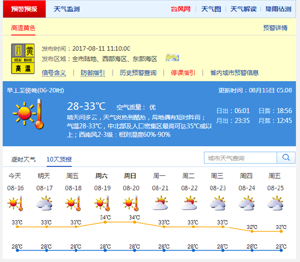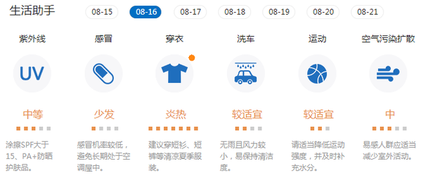 预计16-17日云量略增,多云间晴天,局部有短时阵雨。16日气温28-33℃,中北部及人口密集区最高可达35℃或以上;西南风2-3级;空气相对湿度60%-90%。18-22日晴天间多云,天气酷热。