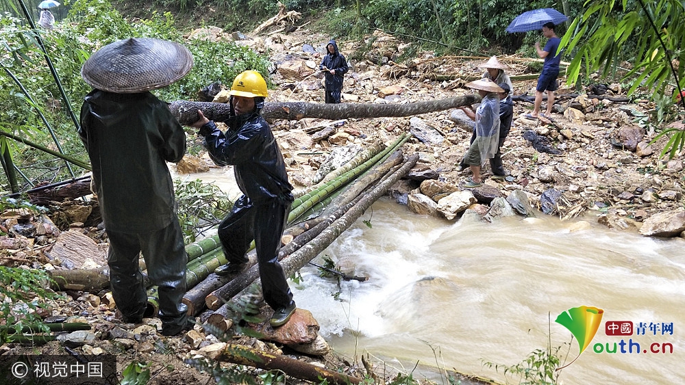 受连日强降雨影响,从13日开始,广西桂林灵川县九屋镇境内的东江流域山洪暴发,导致九屋镇到兰田瑶族乡的文兰公路全线中断。险情发生后,相关部门第一时间整合力量,全力抢通道路,安全疏散被困人员。来源:视觉中国