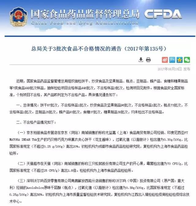 8月15日,国家食药监总局网站公布最新一期的食品安全抽检信息,有3批次样品被检出不合格,分别为: 三只松鼠股份有限公司生产的开心果;三只松鼠官方微博发表《关于部分媒体报道三只松鼠开心果某批次产品问题的情况说明》: