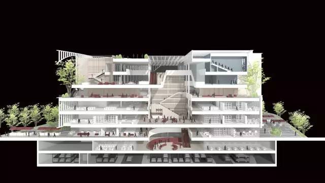 深圳书城龙华城各个楼层设置20%的增值空间,各层成十字叠加,均与城市景观对话,形成无缝的连接,与城市关系良好。