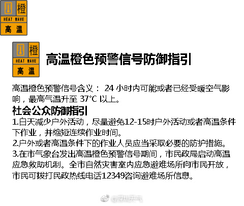 7点30分最新消息: 【深圳市高温黄色预警升级为橙色】深圳市气象台于2017年08月21日07时30分将全市高温黄色预警升级为橙色,预计21日我市最高气温将升至37℃以上,信号可能持续1~2天,用人单位应当视情况于12—15时停止户外或者高温条件下作业,并缩短连续作业时间。 原标题: