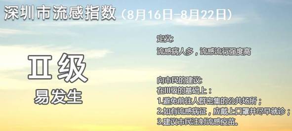 深圳新闻网讯 最近香港夏季流感高发的新闻引起了很多深圳市民的关注,深圳市卫计委于8月20日通报,深圳市流感流行水平已呈下降趋势,但仍处于流感流行期,8月16日-22日,深圳市流感指数为Ⅱ级(易发生),市民尤其是65岁以上老人等个别人群仍需时刻注重个人和环境卫生,积极预防流感。到10月份,全市各社康中心将开始提供最新的流感疫苗,有需要的市民可前往接种。