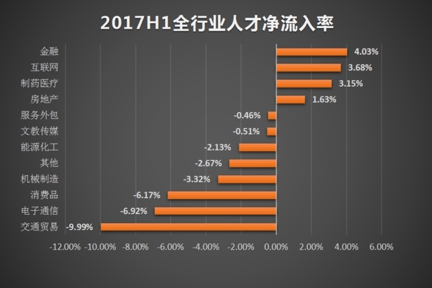 此外,互联网人才净流入率仅次于金融行业,为3.68%。除这四个行业外,其余行业的人才净流率均为负值,不同程度地存在人才流失现象。其中,交通贸易行业人才净流入率最低,为-9.99%,表明该行业人才流失最严重。