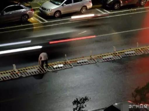 由于事发地光线不好,车流又比较大,他一个人花了近半个小时才将这段护栏摆正。