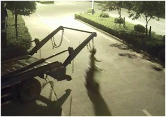 监控视频显示,该垃圾车后部加装有特殊翻斗装置,悬臂伸出车体,垂下的两根粗铁链正悬在辅道上方。