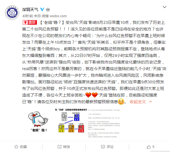 【“老鸽”稳?】受台风“天鸽”影响8月23日早晨10点,我们发布了历史上第二个台风红色预警!!!活久见的各位目前是不是已经待在安全的地方?也许现在不少在公司的朋友们内心有个疑问:“为什么台风红色预警不在早晨上班时候发出?而要在上午10点发出?”