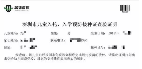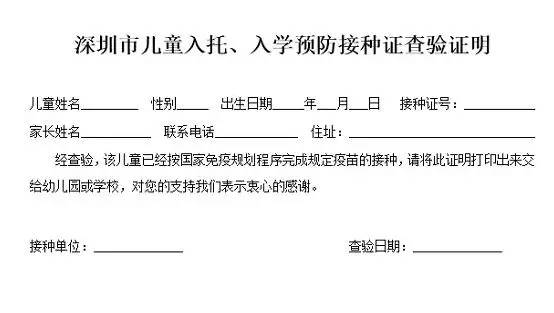 《深圳市儿童入托、入学预防接种证查验证明》