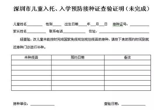 《深圳市儿童入托、入学预防接种证查验证明(未完成)》