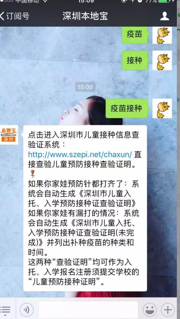 家长可直接登录登陆“深圳市免疫规划之窗http://www.szepi.net”或关注深圳本地宝,后台发送“疫苗接种”,进入“深圳市儿童接种信息查验证系统”,进行网上查验。微信查验的可直接发送到自己的邮箱,然后打印。