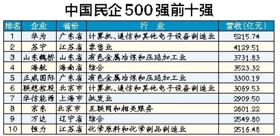 全国工商联主办的2017中国民营企业500强在济南发布。华为苏宁魏桥居前三。