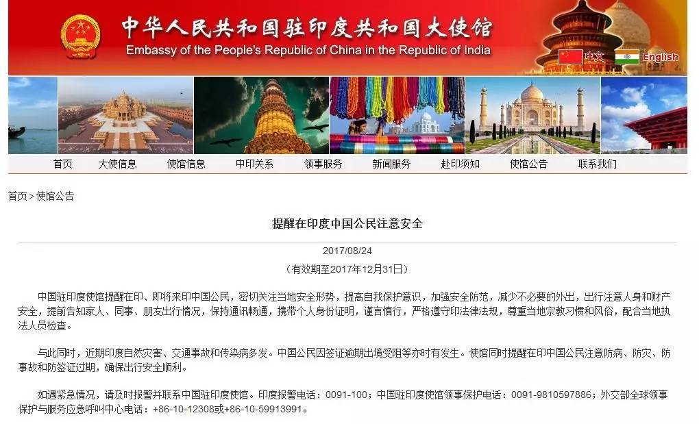 8月24日,中国驻印度大使馆网站发布消息,提醒在印度中国公民注意安全。