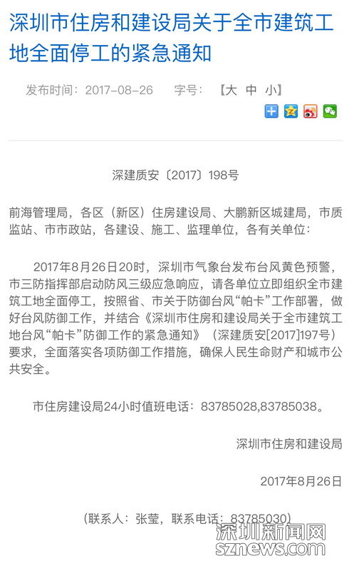 深圳新闻网8月26日讯(记者 余俐洁 通讯员 杨芳华)记者从市住建局获悉,因台风“帕卡”的到来,全市建筑工地全面停工。