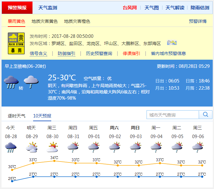 气象专家指出,虽然"帕卡"的路径跟"天鸽"比较相似,从台风自身强度上看,"帕卡"比"天鸽"要弱一个等级,但是"帕卡"在西南季风的支援下携带大量水汽,对深圳降雨的影响要强于"天鸽"。预计28日白天降雨明显减弱,转阵雨天气。