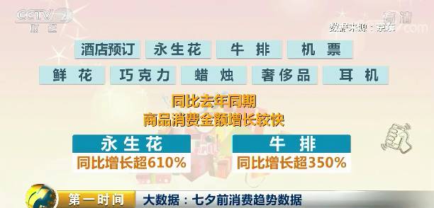 从消费品类别来看,七夕网络热销的商品大都与休闲娱乐相关。来自京东消费数据显示,同比去年同期,酒店预订、永生花、牛排、机票、鲜花、巧克力、蜡烛、奢侈品、耳机等商品消费金额增长较快,其中永生花、牛排同比增长分别超过610%和350%。
