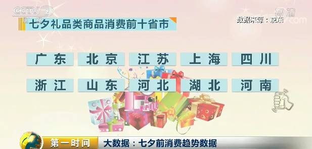 来自京东的消费数据显示,七夕礼品类商品消费前十的省市分别是:广东、北京、江苏、上海、四川、浙江、山东、河北、湖北、河南
