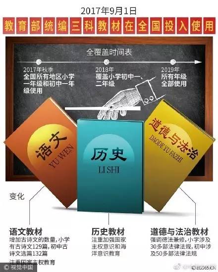 从今年秋季学期起,全国数百万就读于起始年级的小学生和初中生,语文、历史、道德与法治3个科目将统一使用“教育部编义务教育教科书”,现行的“人教版”、“粤教版”、“苏教版”、“北京版”等版本教材将逐步被取代。
