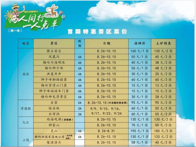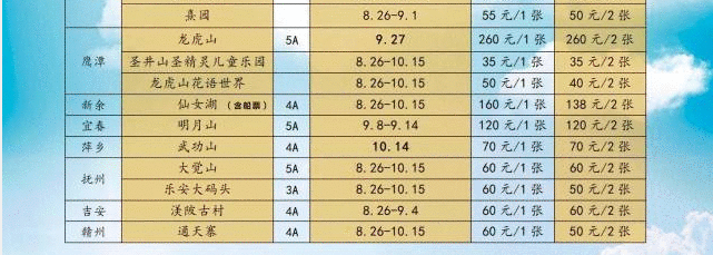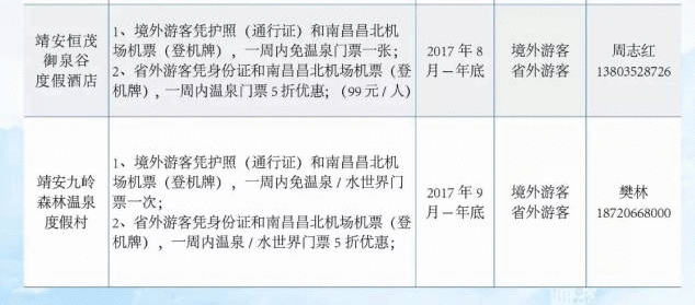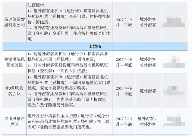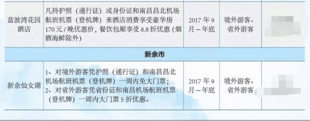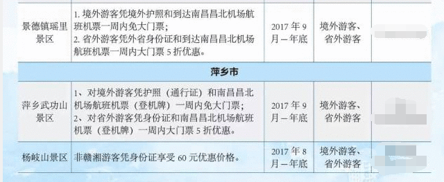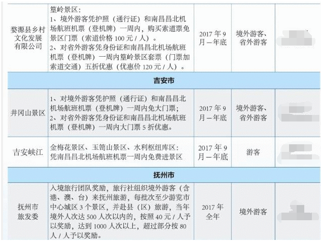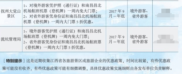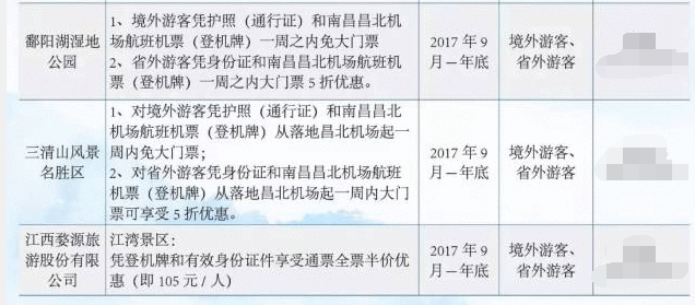 全省5A级旅游景区、部分重点4A级旅游景区对境外游客凭国外护照(通行证)和南昌昌北机场航班机票(登机牌)一周内免大门票;对省外游客凭身份证和南昌昌北机场航班机票(登机牌)一周内大门票5折优惠。