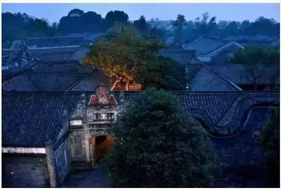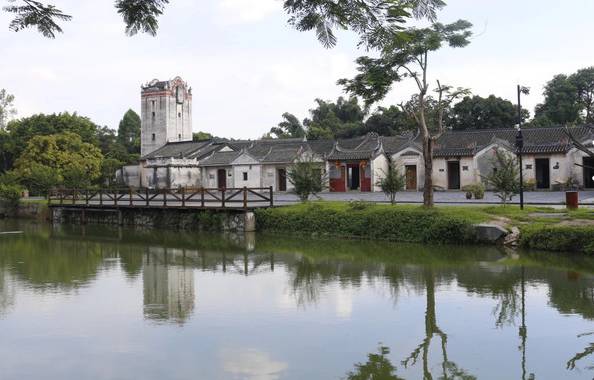 典型客家风格的排屋形制,依山傍水而建,水塘、古井、宗祠、碉楼古色古香,村子被参天大树环抱,椰树、芒果树、榕树等亚热带植物成片相连。