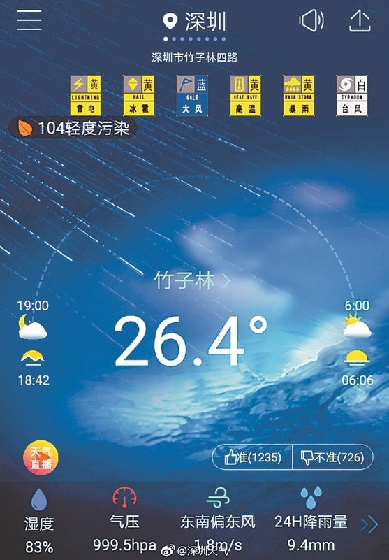 昨日傍晚,深圳气象台同时挂出了六个预警信号。