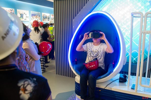 建设方用多种科技手段向各界来宾介绍项目建设概况。这是校园风光VR体验设备。