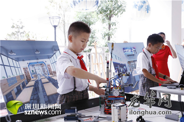 上芬小学新校机器人互动体验区学生正在拼装机器人。