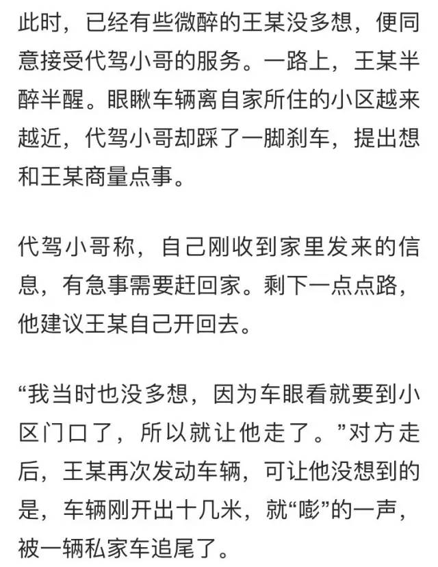 新闻提要 受害人姓王,本月初的一次酒局结束后,醉醺醺的王某正想打开APP找个代驾。王某见状,只得答应对方的赔偿要求,拿出5万元跟他私了,随后还得自费修车。3 一定要让代驾司机将车停到停车位再结束服务,千万不要因为过于自信或者心软在目的地附近结束服务,自己驾车。