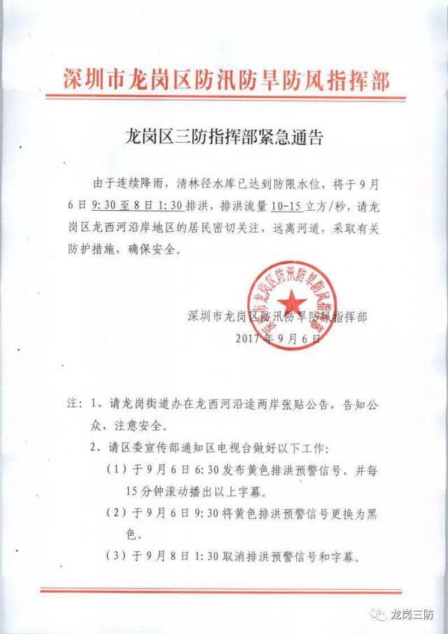 深圳新闻网讯 由于连续降雨,清林径水库已达到防限水位,龙岗区三防指挥部 5 日发出通知,清林径水库将于今日上午 9 时 30 分至 9 月 8 日凌晨 1 时 30 分排洪!