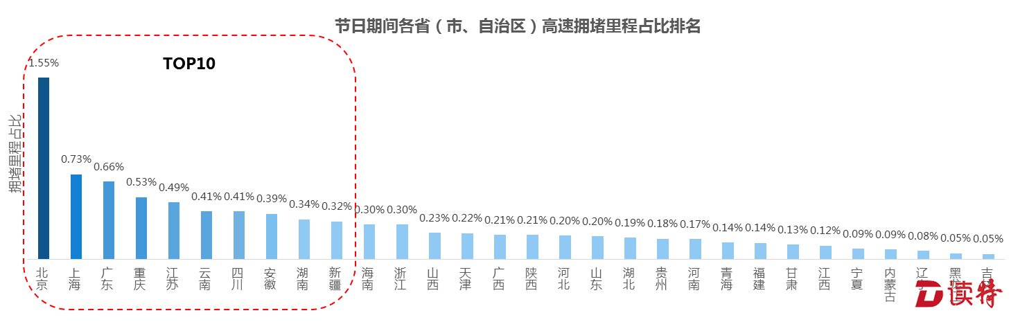 节日期间各省高速拥堵里程排名中,南方高速拥堵要高于北方,广东省高速拥堵里程最高,达102.7公里,与二、三名拥堵里程之和相近。