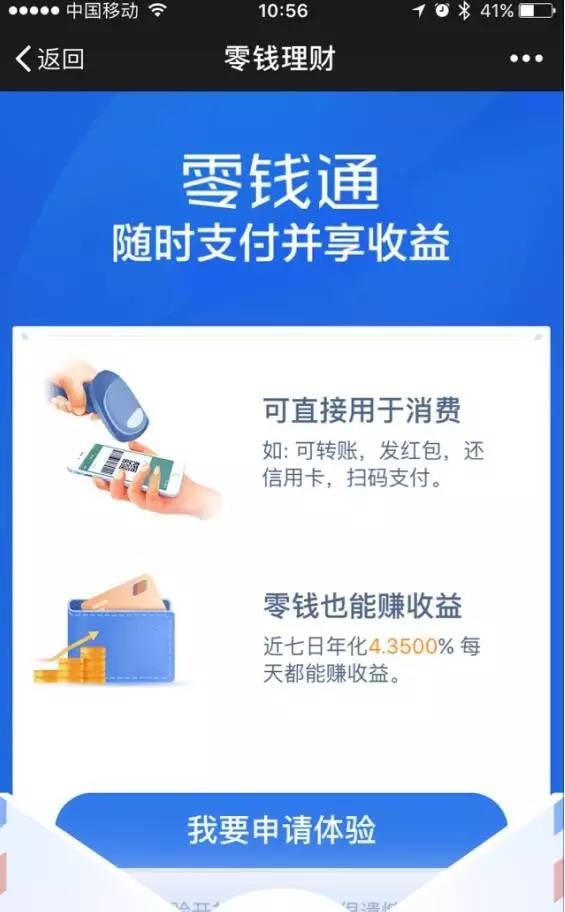 据悉,用户在微信零钱中的余额可设置转入零钱通,享受货币基金收益,近七日年化收益率4.135%。与此同时,用户可直接使用零钱通进行消费,如转账、发红包、扫码支付、还信用卡。