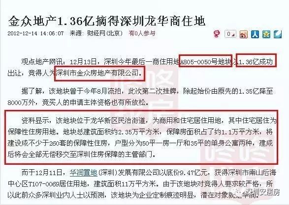 该项目用地是于2012月12日13日被深圳市金众地产集团有限公司,通过土地拍卖获得,土地性质属于商业用地(建面11260平米)+保障房居住用地(11200平米)。