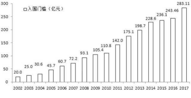 2017中国企业500强的入围门槛为营业收入283.11亿元,达到历史新高,较上年大幅提高了39.65亿元,提高幅度是自2002年发布中国企业500强以来以来最大的。