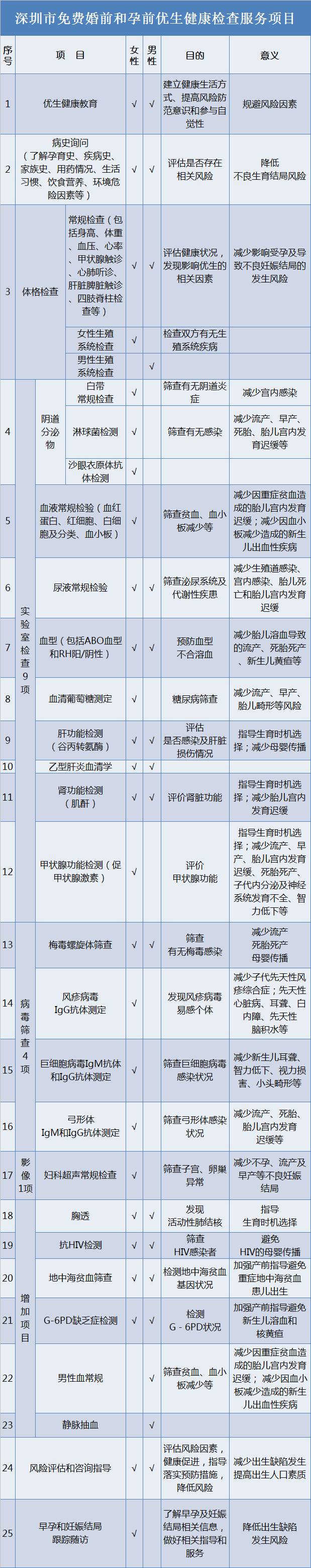2012年12月,深圳出台新办法,将免费婚检和免费孕前优生健康检查结合起来,一共有25项。
