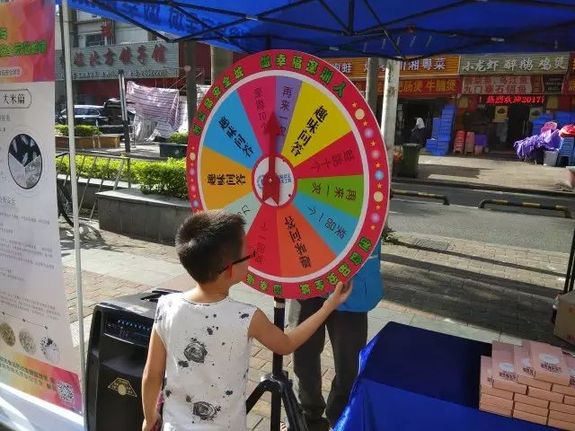 活动现场摆放了很多宣传资料,还有互动游戏,一位戴眼镜的小男孩站在游戏转盘前认真研究,通过游戏活动,他开心地表示既赢得了礼品,又收获了食品安全的常识,懂得了饮食规律的重要性。