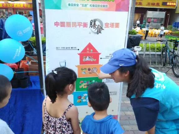 还有几位学生站在中国居民平衡膳食宝塔的易拉宝前,仔细观察营养结构,觉得非常实用有趣,工作人员与其耐心交流,告诉他们要注意荤素搭配,合理饮食。