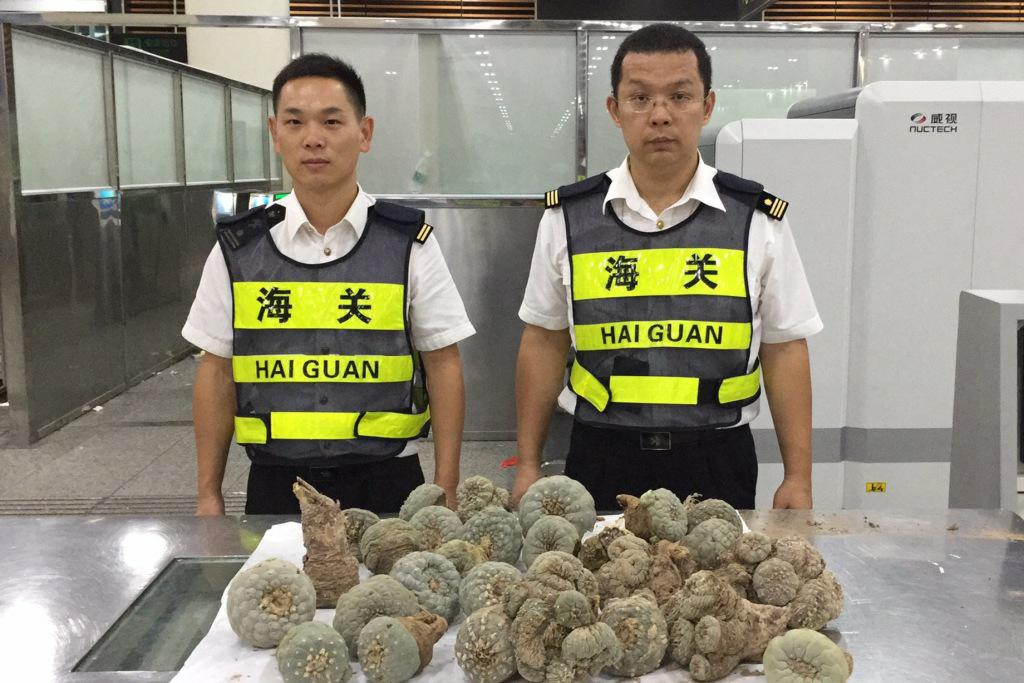 近日,深圳皇岗海关在福田口岸旅检入境大厅查获有名的“毒素仙人掌”——“乌羽玉”,共50株13.6千克。这是该关首次查获该类案件。