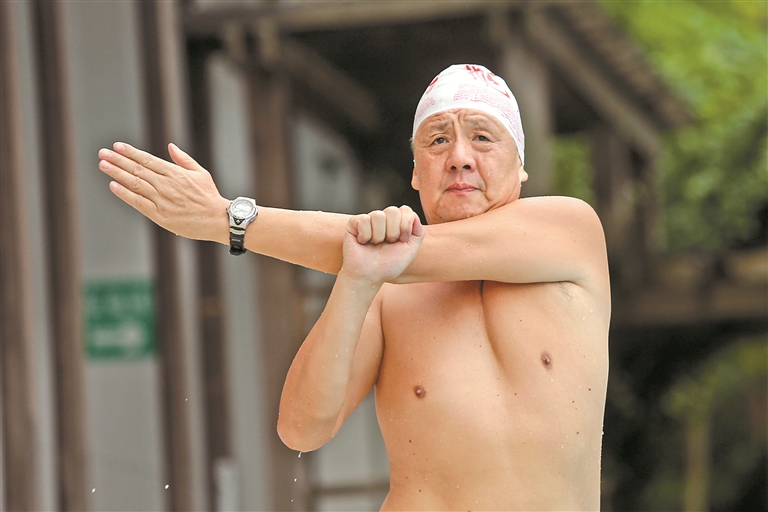 横渡长江后的刘明益老人。刘明益老人游泳前正做热身运动。最让老人骄傲的是,今年7月他用自己喜欢的蛙泳泳姿横渡了约6000米游程的长江。” 8日下午,刘明益带着妻子张娅玲来到了青青世界的游泳馆,售票的小伙一见夫妻俩就笑着打招呼。