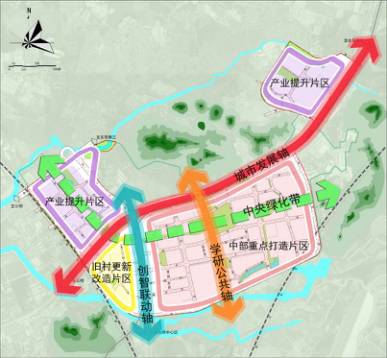 两翼产业提升片区——以创新产业与高新制造业为主,促进产业转型提升,完善基础设施建设。
