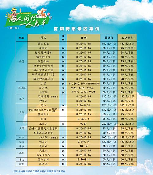 优惠内容:全省5A级旅游景区、部分重点4A级旅游景区对境外游客凭国外护照(通行证)和南昌昌北机场航班机票(登机牌)一周内免大门票;对省外游客凭身份证和南昌昌北机场航班机票(登机牌)一周内大门票5折优惠。