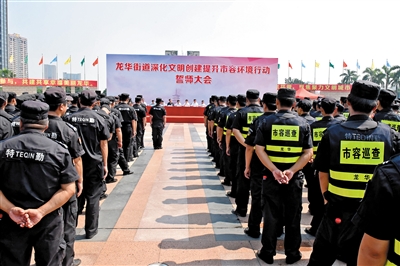 “齐抓共管、真抓实干,攻坚克难、奋勇争先!”烈日下,执法队员、环卫工人、义工代表、市容巡查员、居民代表等千余人铿锵发声,响彻龙华文化广场。16日上午,龙华街道召开“深化文明创建提升市容环境行动”誓师动员大会。