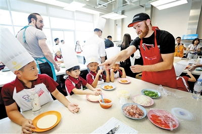 与此同时,在柏朗思观澜湖学校,WWE另一名中国选手王彦博(Big Boa)携手萨米·扎恩、贝基·林奇等明星,跟现场20名来自观澜湖幼儿园的小朋友做起了披萨。巨星们手把手带着孩子们给面饼涂上番茄酱,然后撒上芝士、火腿。贝基·林奇很高兴地端着一个小朋友的披萨成品说:“这是我们组里的超级大厨。”随后将做好的披萨分批放进了烤炉中,十分钟后,香味便弥漫了整个厨房。(龙华新闻记者 吴春华 通讯员 陈宵 文/图)